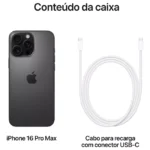 • UM SALTO IMENSO NA BATERIA — O iPhone 16 Pro Max traz eficiência energética incrível com até 33 horas de reprodução de vídeo². Recarregue via USB-C ou com um carregador MagSafe, para recargas sem fio ainda mais rápidas³.